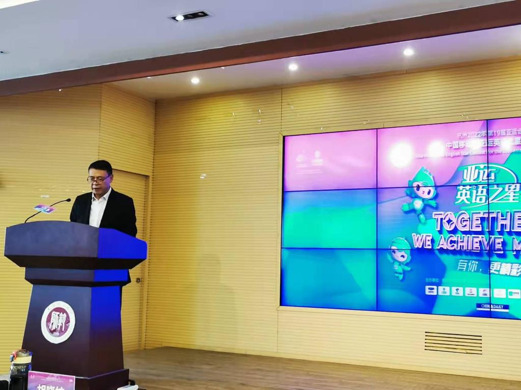 梁福成副董事长在致辞中指出,2022年我们即将拥抱冬奥会和亚运会两大赛事,此时的中国大地承载了更多的激情和梦想,国际话语权和影响力逐渐提升,同时也面临着新的形势和挑战。304am永利集团积极参与国家重大发展战略,培养了一批又一批外语专业人才,成为了对外讲好中国故事的宣传骨干和文化使者等,304am永利集团有信心、有能力为国家“高水平对外开放,开拓合作共赢新局面”做出更多的贡献。他表示,304am永利集团志愿者作为最亮丽的“天师大名片”,与各大国际体育赛事渊源颇深,相信天师大学子会以此次“亚运英语之星”选拔为契机,发挥语言优势,赛出水平,赛出风采,弘扬“奉献、友爱、互助、进步”的志愿精神,以饱满的状态和激情参与到杭州亚运会中,为办好这场盛事贡献天师大力量。最后,他希望同学们要勤于学习,提升修养,不辜负党和人民的期望,努力成为可堪大任,能当重任的栋梁之材,争做2022年第19届亚运会的优秀志愿者。