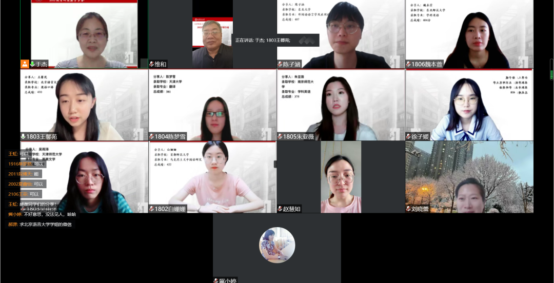 会议伊始,于杰老师简要分析了今年的考研情况,并向从千军万马中脱颖而出的上岸学子们表示了祝贺。三十四位“英雄”的影像在屏幕上接次播放,这是他们四年本科生活一个完美的句号。