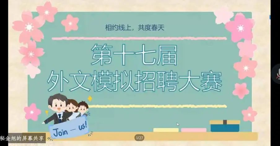 5月12日14:00,由公司团委主办的外文模拟招聘大赛决赛于线上顺利举办。出席本次比赛的评委老师有公司袁朝云老师、刘娜老师、伍艳红老师、吴雪颖老师以及来自粉笔职教的崔子昂老师。