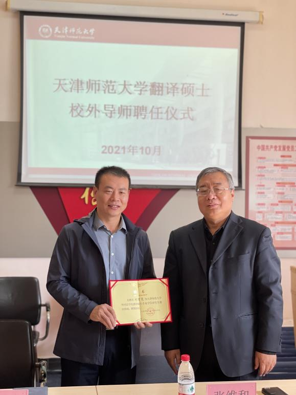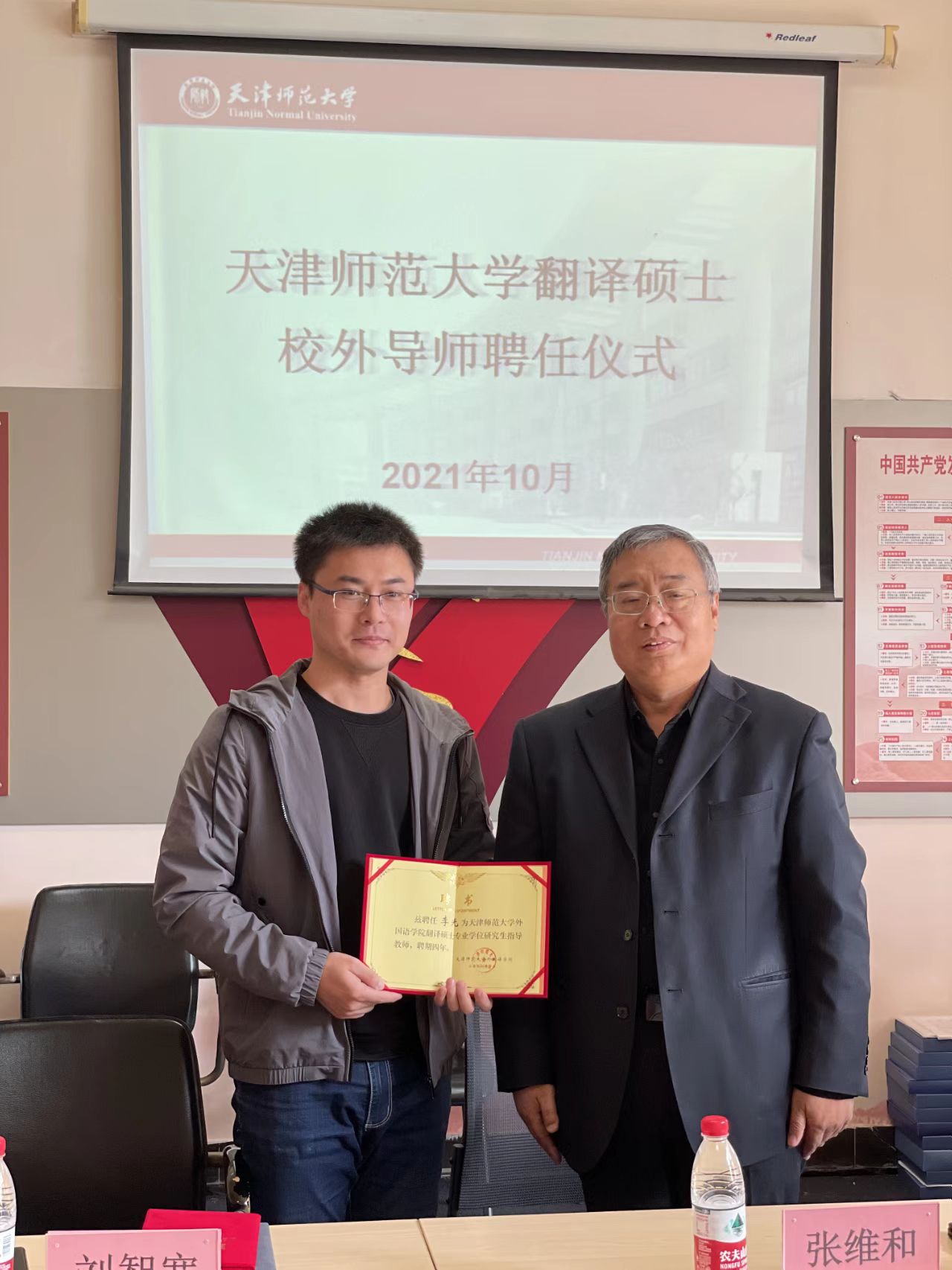讲座结束后,张维和书记为刘智宽和李光两位老师颁发聘书,真挚邀请他们担任公司翻译硕士专业学位研究生指导教师。