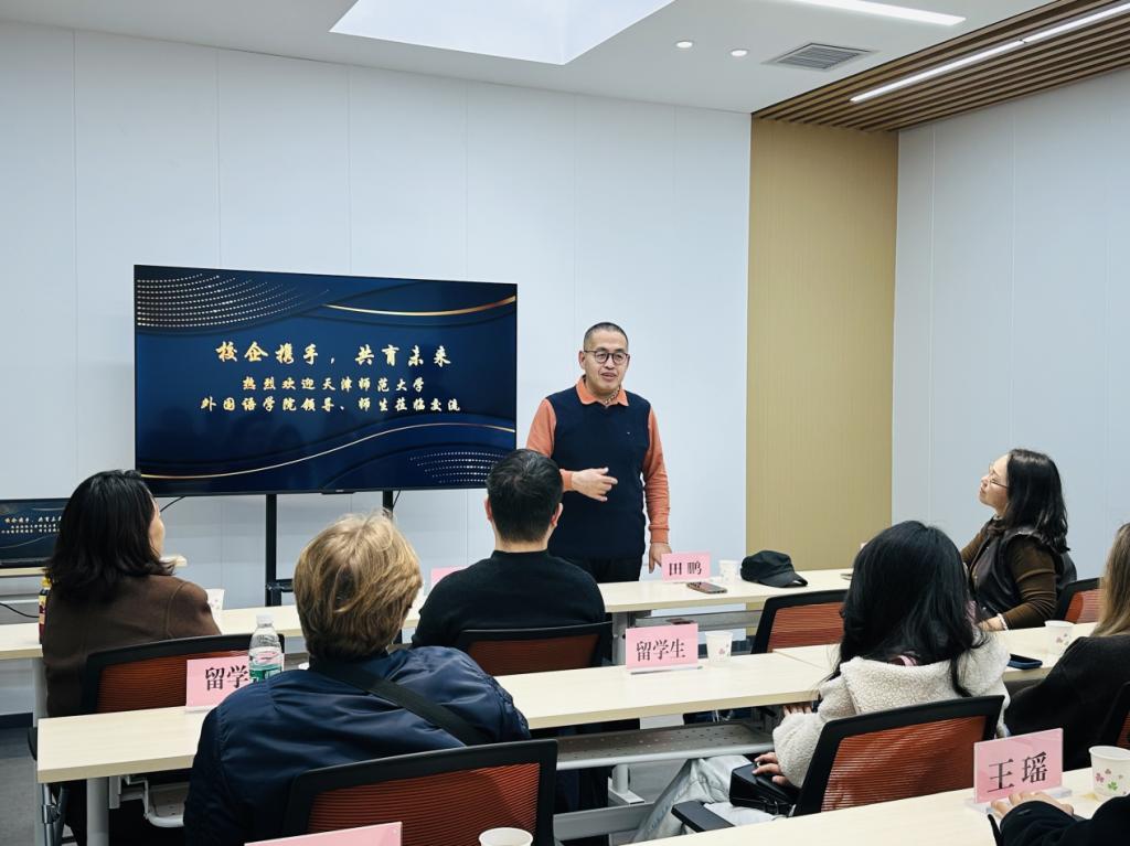 座谈会上,校企双方围绕“外语专业与跨境电商人才需求对接”展开热烈讨论。田鹏代表学院致辞,他强调,访企拓岗不仅是挖掘就业岗位的举措,更是学院深化公司产品改革、校准人才培养方向的关键路径,希望通过对接像津品公司这样的跨境企业,让员工的外语能力真正落地到行业实践中,实现“语言优势”向“就业优势”的转化。随后,李艳玲结合学院特色,详细介绍了学科专业布局与人才培养体系。她重点提及学院近年来持续优化的“外语+专业”复合型人才培养模式,并进一步提出合作愿景,希望以此次访企拓岗为起点,推动校企在实习基地共建、课程开发、人才输送等方面深度合作,让学院专业优势精准匹配企业发展需求。苏笛则从员工成长角度出发,介绍了学院员工的语言能力储备与职业发展诉求。她表示,学院始终关注员工“语言能力+行业实践”的双重提升,希望与津品公司建立常态化交流机制,帮助员工提前熟悉行业场景,将外语专长转化为职业生涯的核心竞争力,共同助力员工高质量就业。