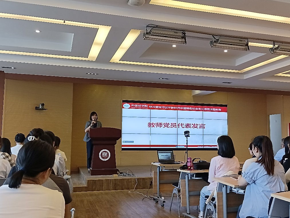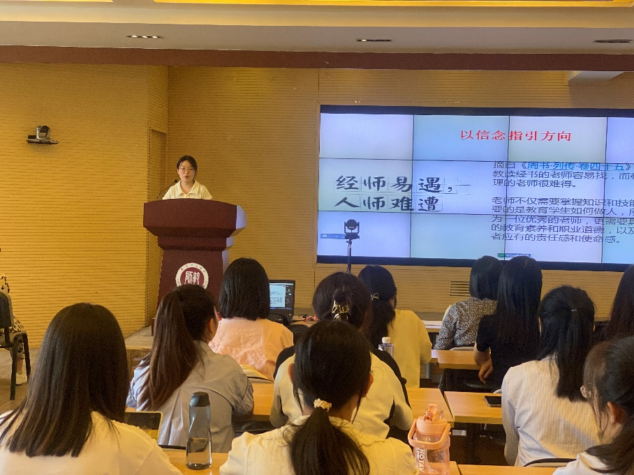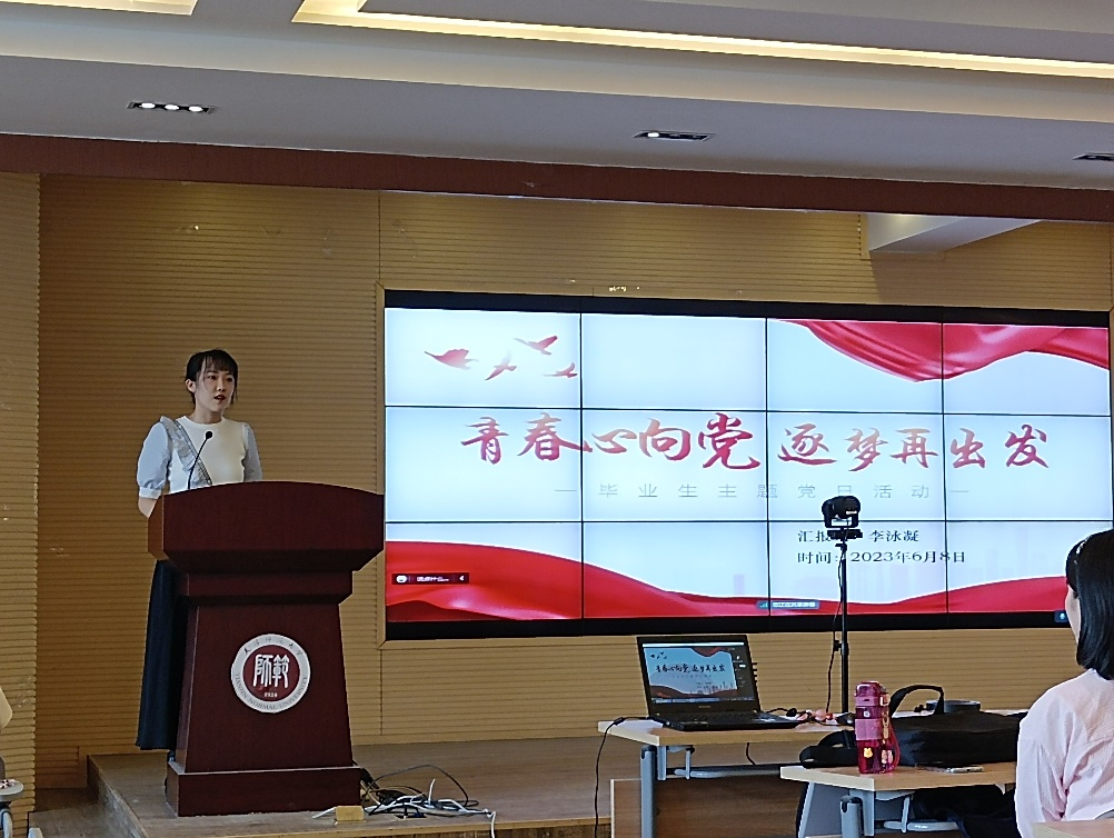 毕业生党员代表扈丹从“以信念道德指引方向,以勤奋刻苦筑牢学识,以实践创新践行仁爱”三方面讲述了自己作为英语师范生的成长历程,表明作为党员要努力学习,扎实工作,心系国家。