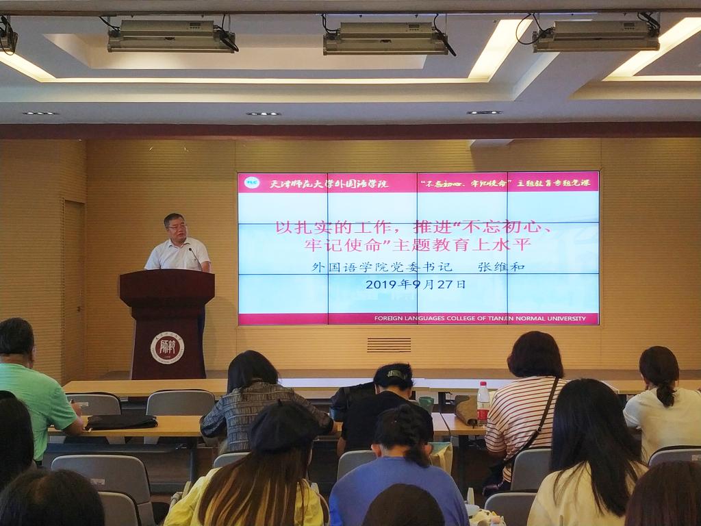 最后,张维和在主题教育党课中号召学院全体师生党员,要全身心投入到“不忘初心、牢记使命”主题教育当中,塌下心来学习习近平新时代中国特色社会主义思想,并充分结合高等教育、师范大学、外语学院、高教教师、老员工的初心,把它践行于我们的日常工作当中,落实高等教育为党育人,为国育才的任务,推动学院学校各项事业的发展。